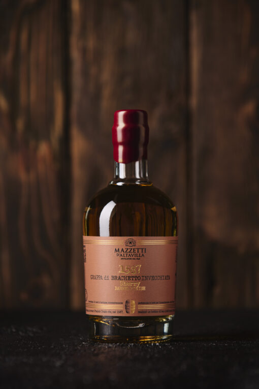 Grappa di Brachetto che continua il perfezionamento in botti precedentemente utilizzate per l’invecchiamento dello Sherry.